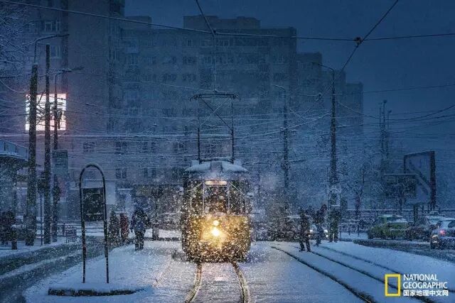 罗马尼亚雅西市,一辆有轨电车在暴风雪纷飞的清晨穿行