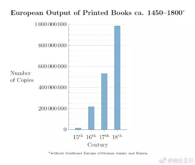 @硅谷王川 原来有个错误的印象,以为欧洲文艺复兴的主要原因是 1453 年土耳其攻陷君士坦丁堡,把东罗马帝国的知识分子赶到西欧。现在看来实际原因是 Gutenberg 1450年在欧洲推出第一个实用廉价的活体印刷系统。十五世纪欧洲印刷的书是一千万本左右,十六世纪就变成两亿本了。社会发展程度,和信息的数量和传播带宽正相关