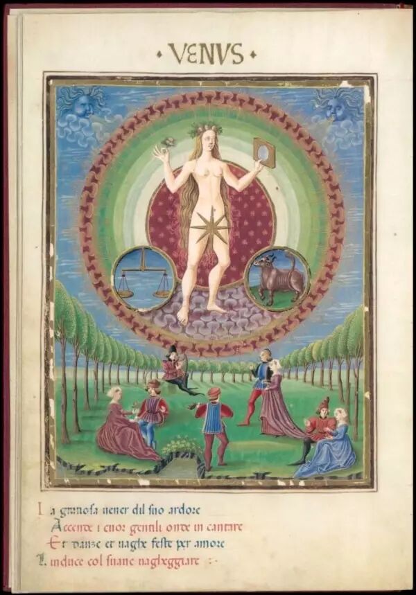 【30】〈De Sphaera〉,神格与人格化的太阳系行星,同时不同的行星对应不同的星座,创造于十四世界罕见的彩色版系列插画,藏于意大利的埃斯特公爵家族图书馆。